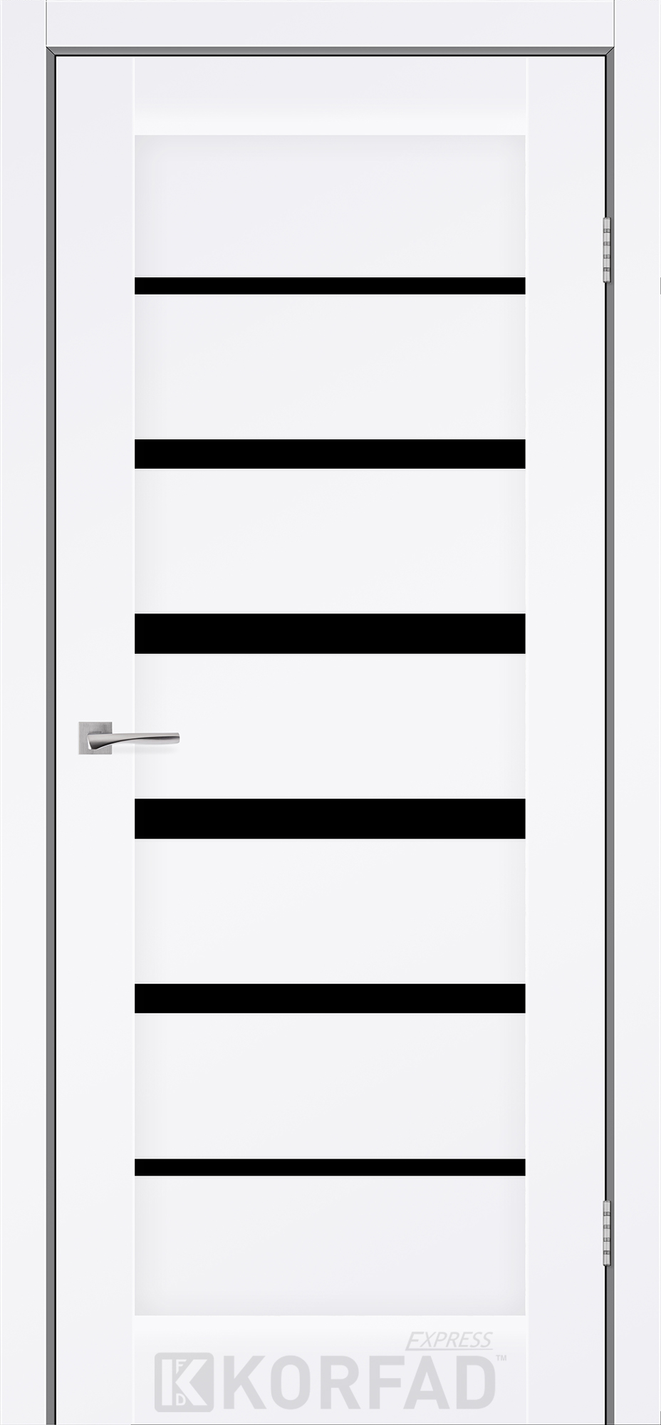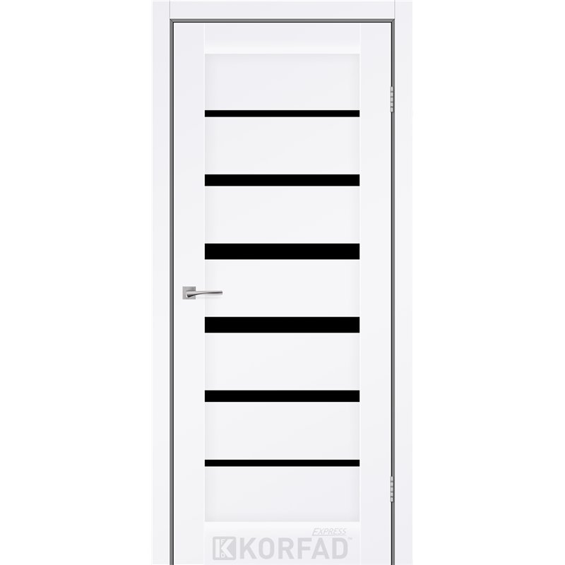 Межкомнатные двери KORFAD EXPRESS PESTO Белый Мат Черное стекло, современные царговые двери, сочетающие в себе надежность натурального дерева и инновационные покрытия.