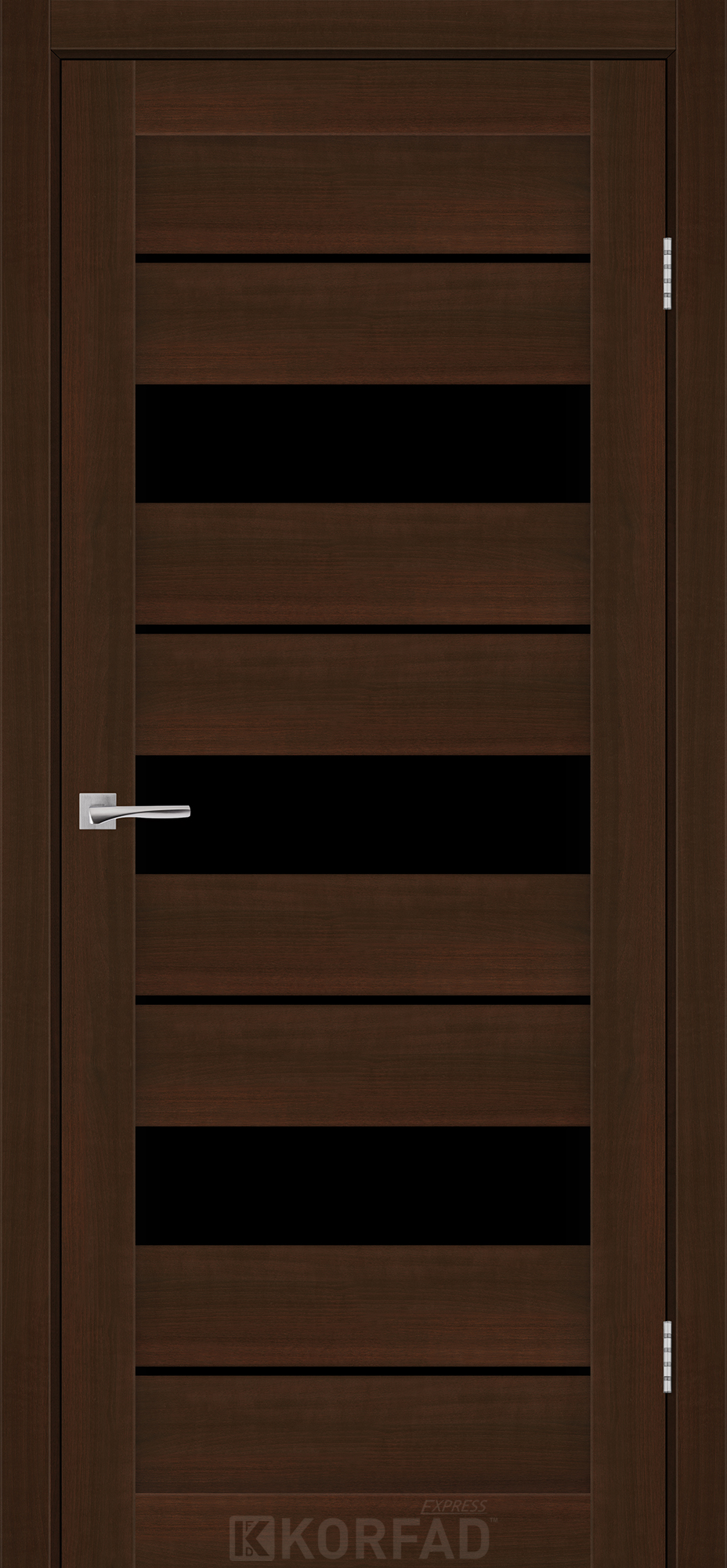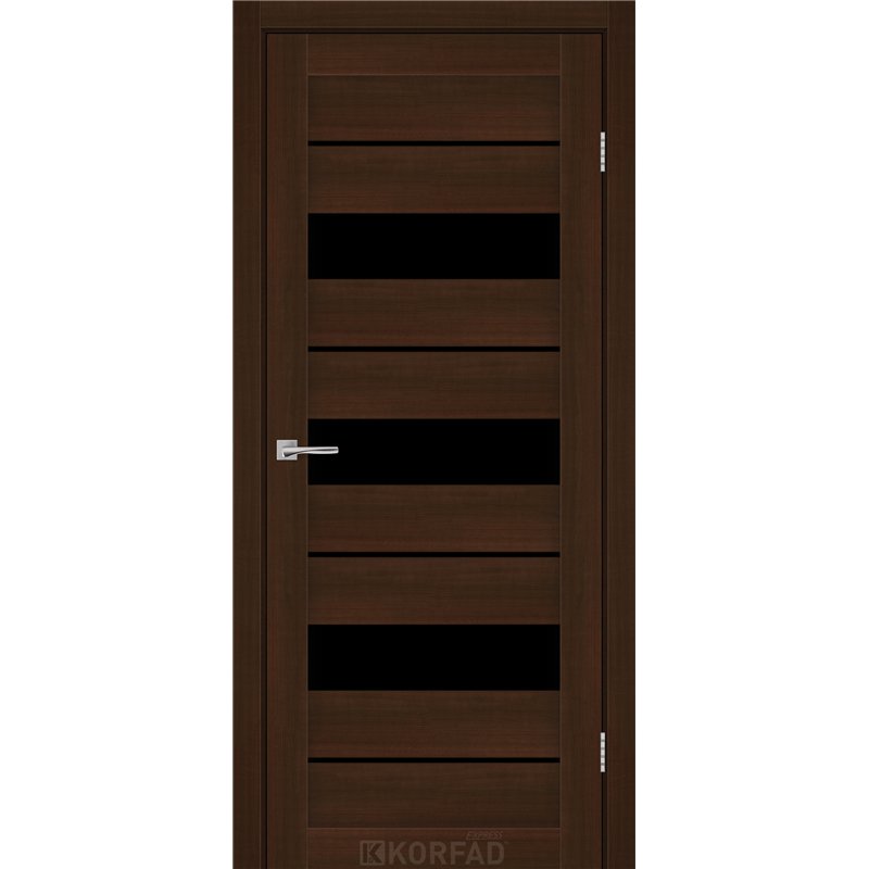 Межкомнатные двери KORFAD EXPRESS CORRIS Каштан Бурбон Черное стекло, современные царговые двери, сочетающие в себе надежность натурального дерева и инновационные покрытия.