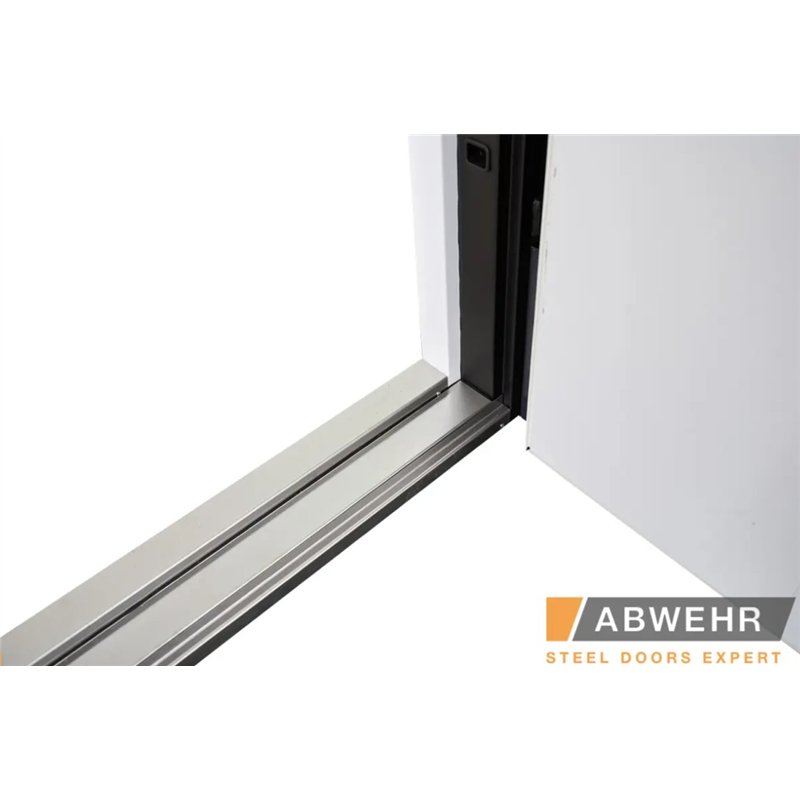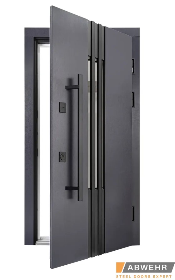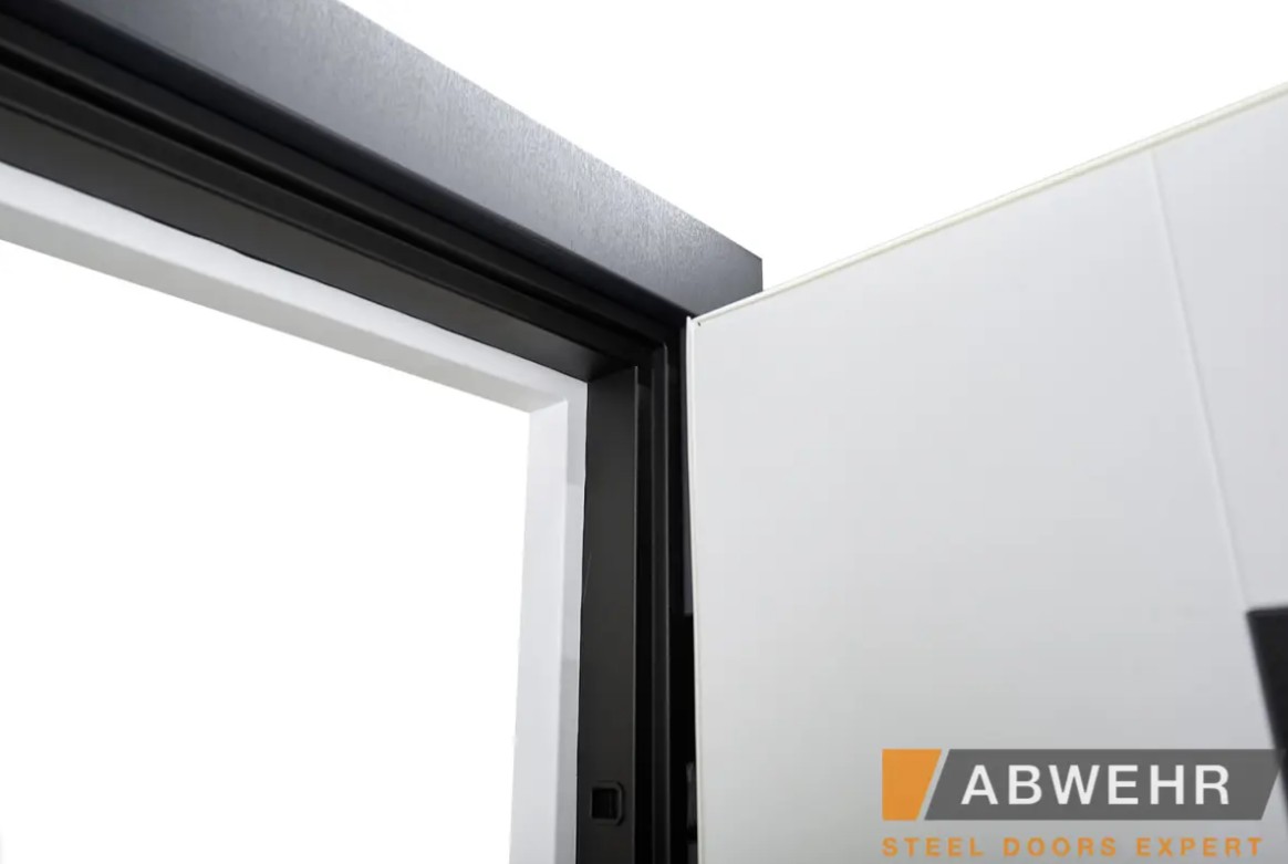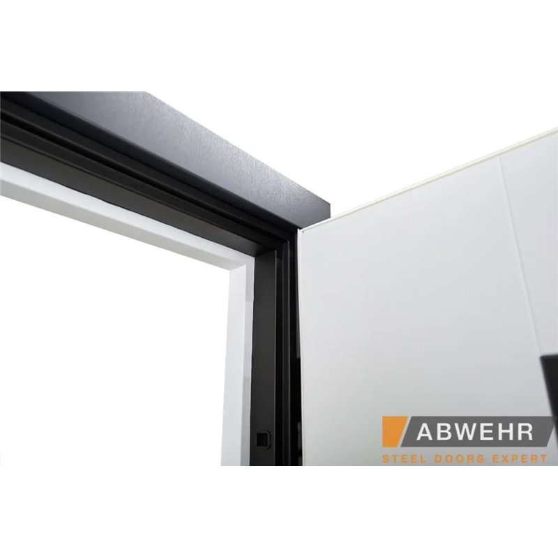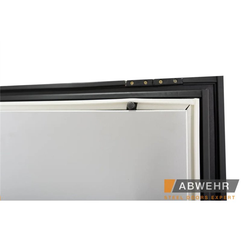 Дополнительный терморазрыв на основе пробкового дерева или пенополистирола предотвращает промерзание зимой и образование конденсата в теплое время года, делая двери Abwehr отличным решением для уличной установки.