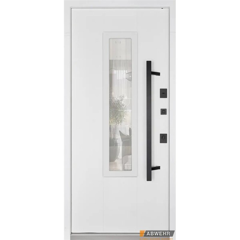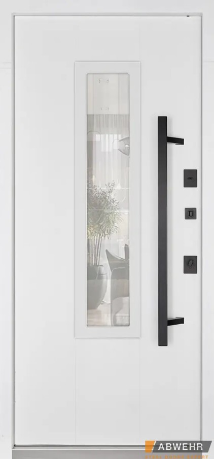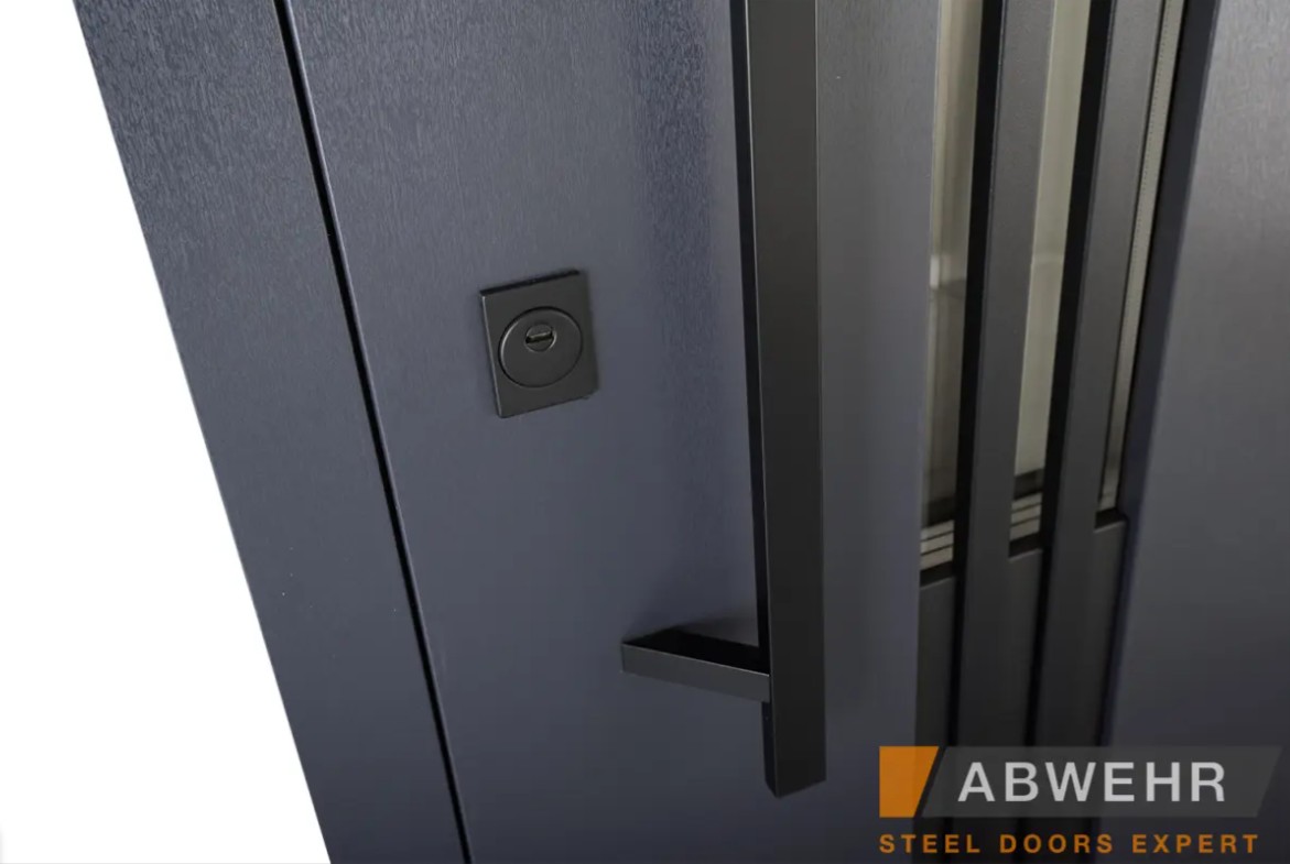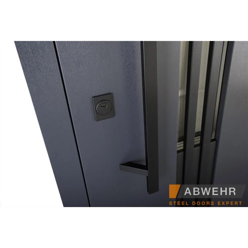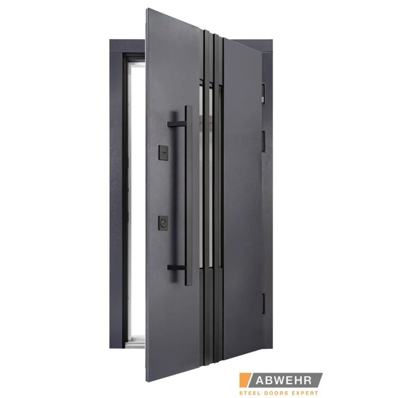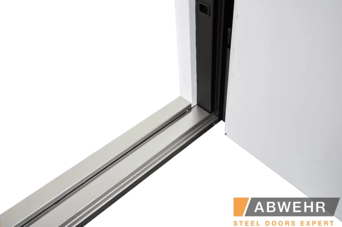 Дополнительный терморазрыв на основе пробкового дерева или пенополистирола предотвращает промерзание зимой и образование конденсата в теплое время года, делая двери Abwehr отличным решением для уличной установки.