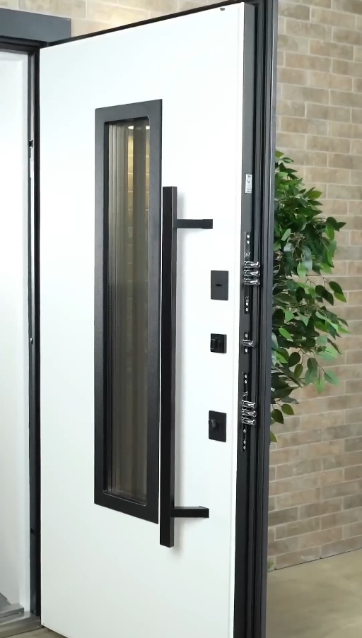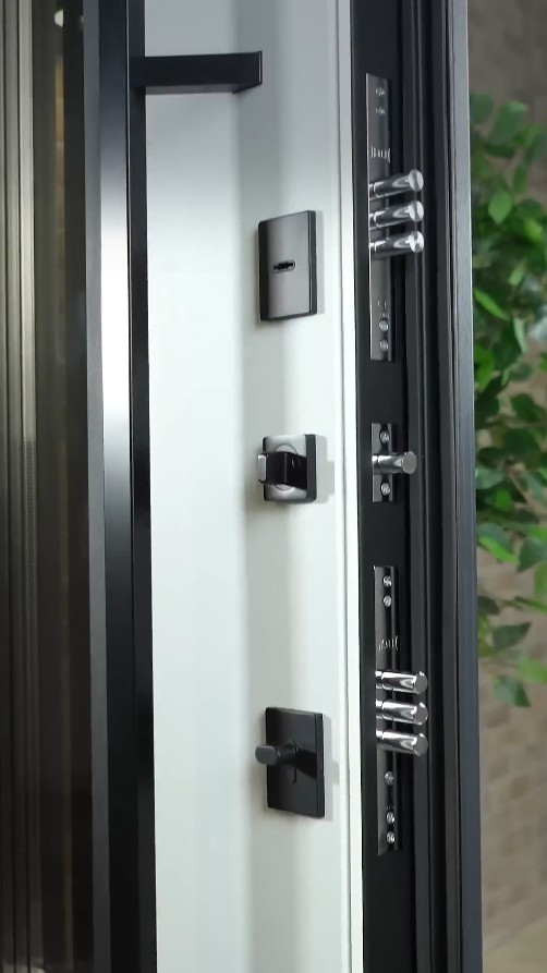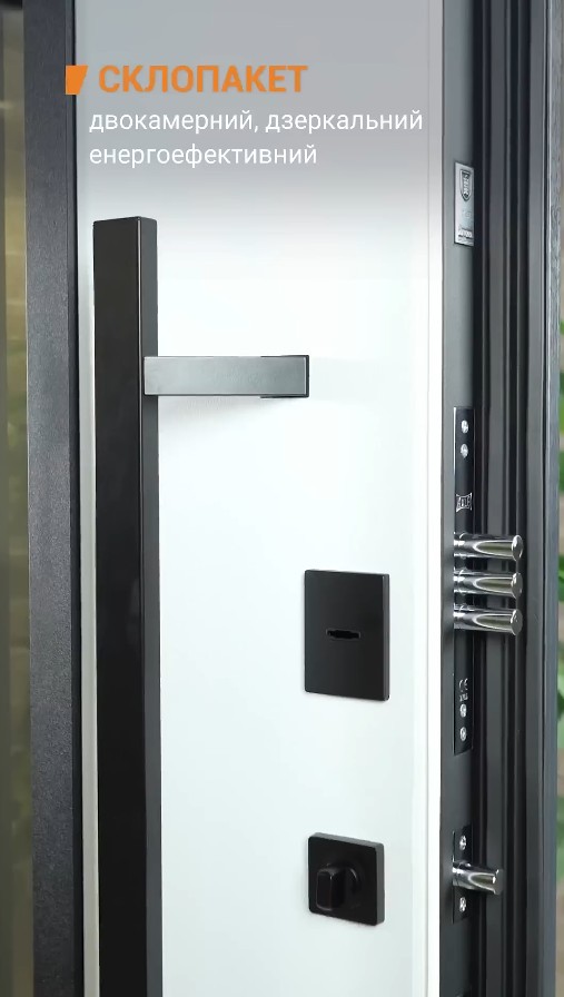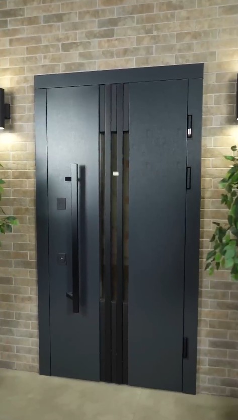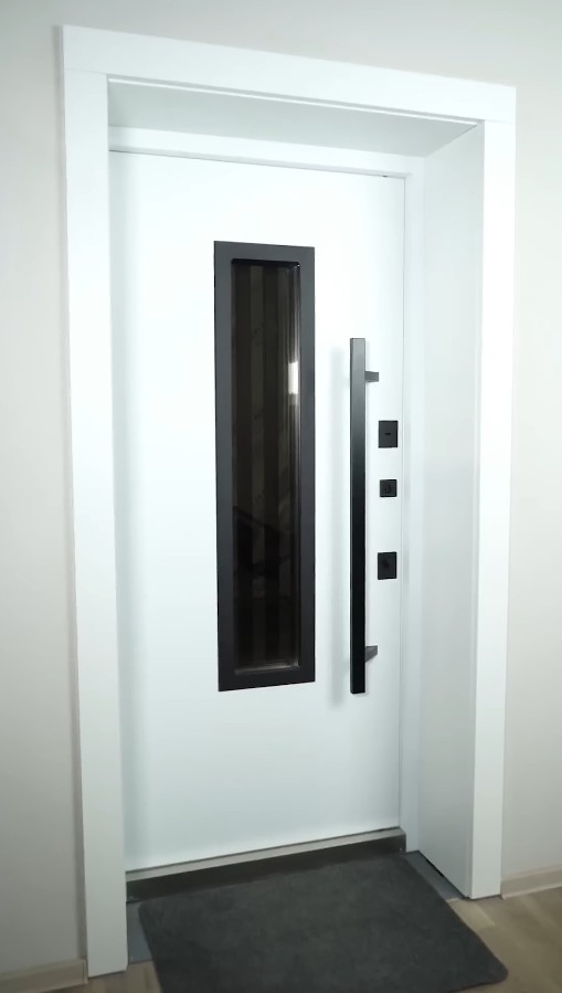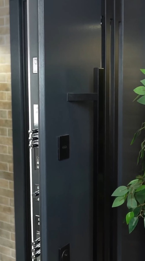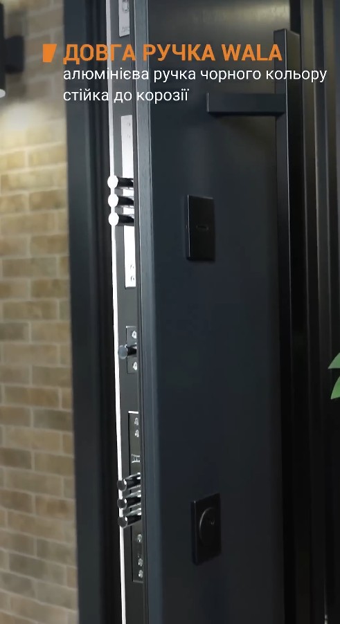 Модель комплектуется элитной польской фурнитурой в матовом черном цвете. Дизайнерский акцент — длинная вертикальная ручка Wala, которая придает двери премиальный вид. Она не только удобна в эксплуатации, но и является ключевым визуальным элементом, подчеркивающим высоту и мощь двери. Квадратные черные броненакладки на замках дополняют строгий и современный образ входной группы.