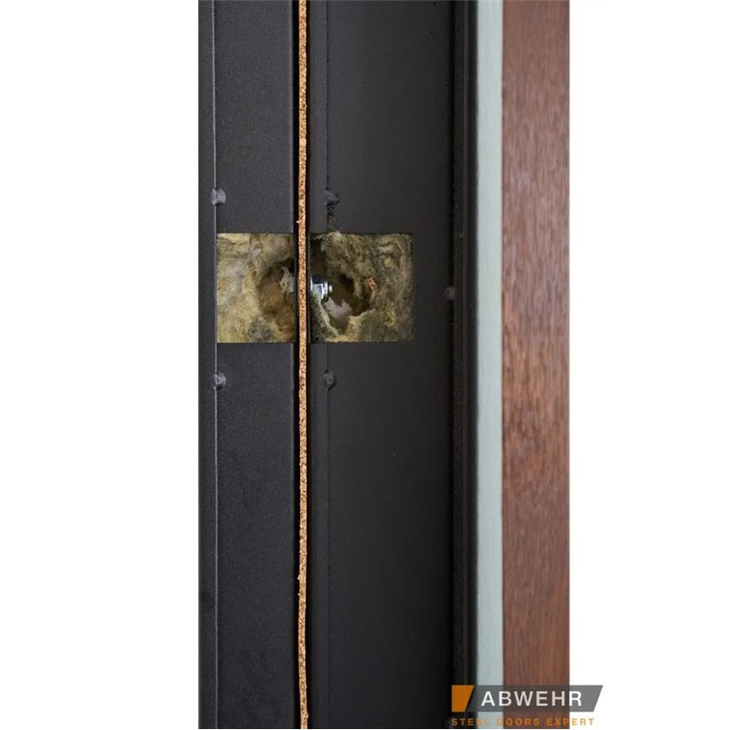 Конструкции Abwehr спроектированы с акцентом на тепло- и шумоизоляцию. Внутреннее заполнение полотна включает минеральную вату повышенной плотности, фольгированный изолятор и до трёх контуров магнитного уплотнения, что эффективно защищает помещение от уличного шума и холода, снижая уровень внешних звуков до 46 дБ.