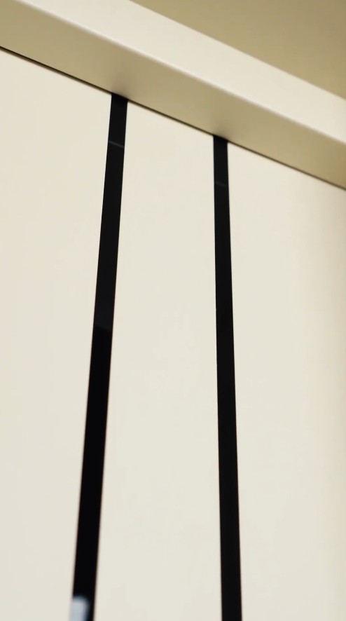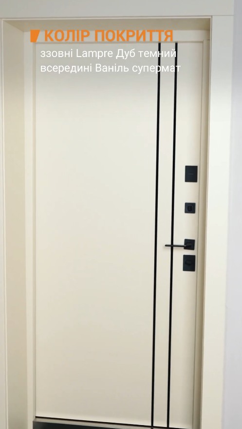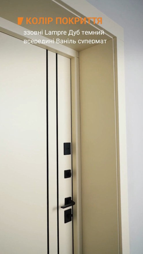 Внутренняя сторона двери выполнена из влагостойкой МДФ-панели толщиной 10 мм в цвете «Ваниль супермат» с черными вертикальными полосами. Такое решение идеально подходит для светлых прихожих, визуально увеличивая пространство и создавая атмосферу уюта. Дизайн внутренней панели перекликается с современными трендами в интерьере.