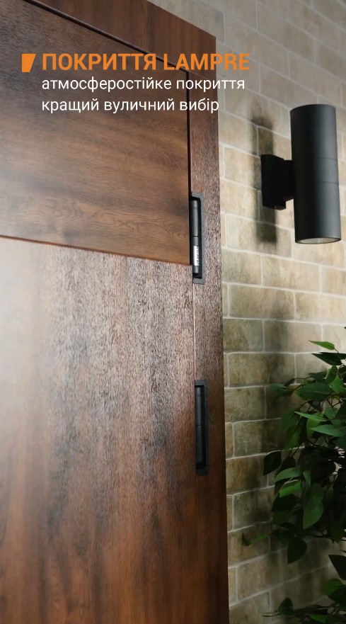 Снаружи дверь облицована оцинкованным листом металла по итальянской технологии Lampre в цвете «Дуб темный». Оригинальный геометрический рисунок в стиле модерн придает фасаду динамичность. Покрытие Lampre обладает исключительной устойчивостью к морскому воздуху, влажности и прямым солнечным лучам, сохраняя первозданный вид на долгие годы.