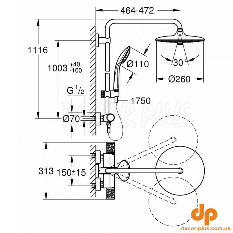 Душ система EUPHORIA 260 душ (термостат+стійка+лійка (3 пол)+шланг 1,75м+верх душ), хром