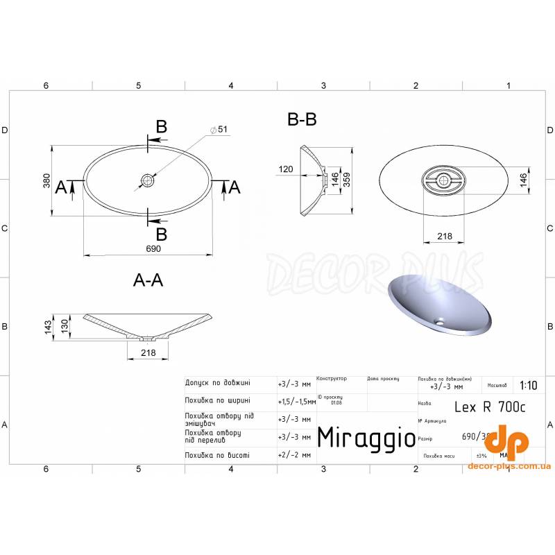 | Назва | Умивальник накладний MIRAGGIO LEX R 14,3*69*38 Mirasoft Білий 0001020 |