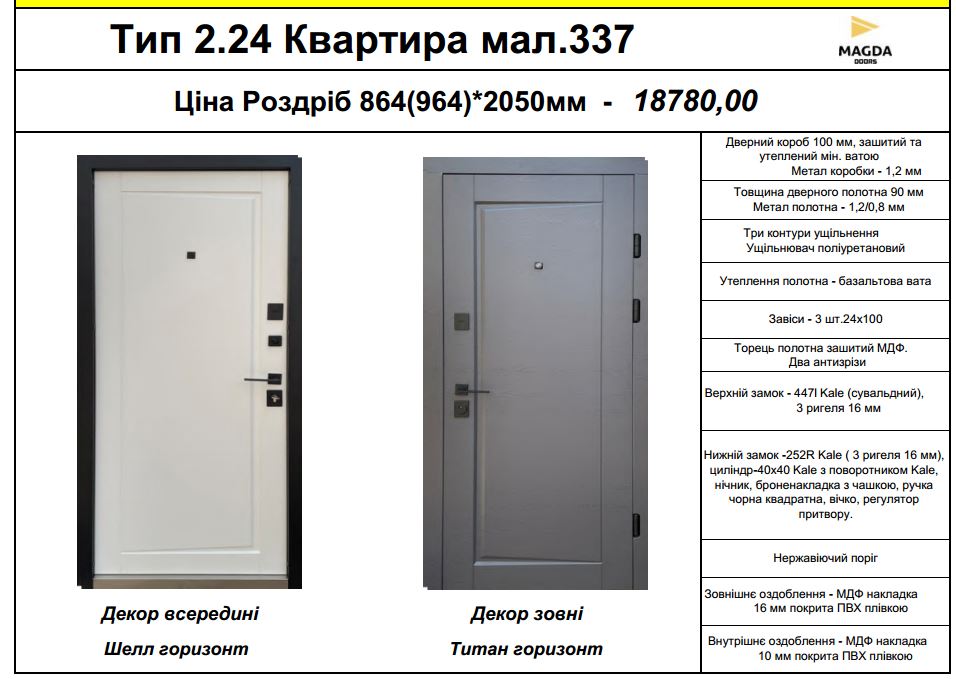 Вхідні двері MAGDA Тип 2.24 (Квартира, малюнок 337) — ідеальне поєднання надійності, тепла та стилю для сучасної квартири. Посилене металеве полотно 90 мм із базальтовою ватою, короб 100 мм зі сталі 1,2 мм, два замки Kale (сувальдний і циліндровий), нержавіючий поріг та МДФ-панелі з зносостійкою ПВХ-плівкою. Триконтурне ущільнення забезпечує відмінну звуко- та теплоізоляцію, а антисрізи й захист від підпилювання — високий рівень безпеки.