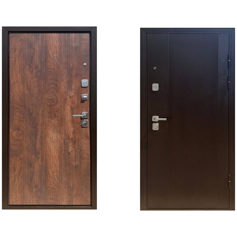Для захисту від агресивного зовнішнього середовища, вологи та перепадів температур фасад дверей виконано з цільного листа металу. Поверхня покрита стійким порошковим напиленням у кольорі «Мідь» із декоративним тисненням. Таке покриття не лише надає дверям солідний вигляд, а й служить надійним антивандальним бар’єром, що особливо важливо, якщо ви обираєте вуличні двері для приватного сектора.