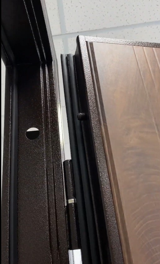 Двері оснащені трьома надійними петлями на підшипниках, які забезпечують плавний і безшумний хід навіть важкого полотна. Для запобігання силовому взлому шляхом зрізання петель конструкція підсилена трьома антизрізами. Це обов’язковий стандарт безпеки для якісних вхідних дверей.