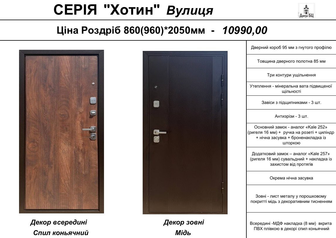 Безпека: Основний замок (ригеля 16 мм), додатковий замок (сувальдний), броненакладка, нічна засувка.