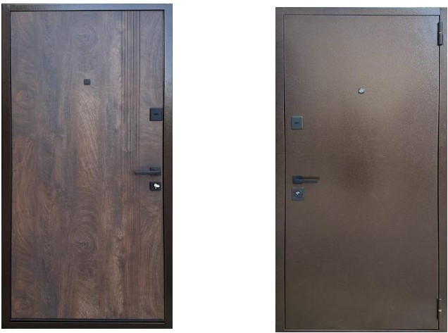 Зовнішня сторона дверей оформлена в лаконічному сучасному стилі. Поверхня металу вкрита міцною порошковою фарбою кольору «Мідь» — глибокий коричневий відтінок із благородним характером. Таке покриття ефективно захищає метал від корозії, вологи та вигорання на сонці, що особливо важливо для вуличних дверей. Практична гладка поверхня не боїться забруднень, легко очищується та довго зберігає охайний зовнішній вигляд.