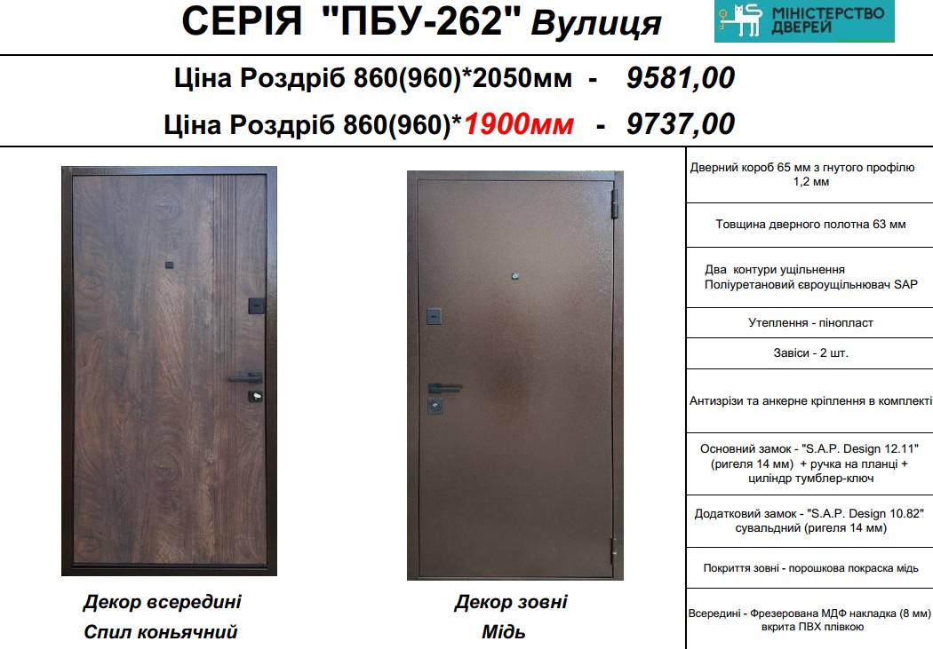 Вхідні двері «Міністерство Дверей» — серія ПБУ-262 Мідь «Вулиця» створені для тих, хто цінує надійність і практичність. Якщо вам потрібні міцні вхідні двері для приватного будинку, зверніть увагу на модель ПБУ-262 від перевіреного українського виробника. Вона поєднує доступну ціну, гідну якість та адаптацію до експлуатації на вулиці. Для тих, хто планує купити вхідні двері в Одесі з урахуванням вологого та сонячного приморського клімату, цей варіант стане раціональним рішенням. Стриманий зовнішній вигляд і продумана конструкція забезпечують безпеку та комфорт вашого дому.