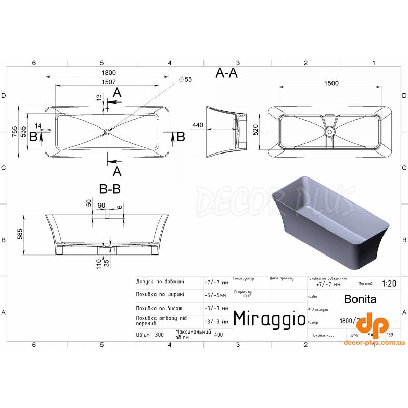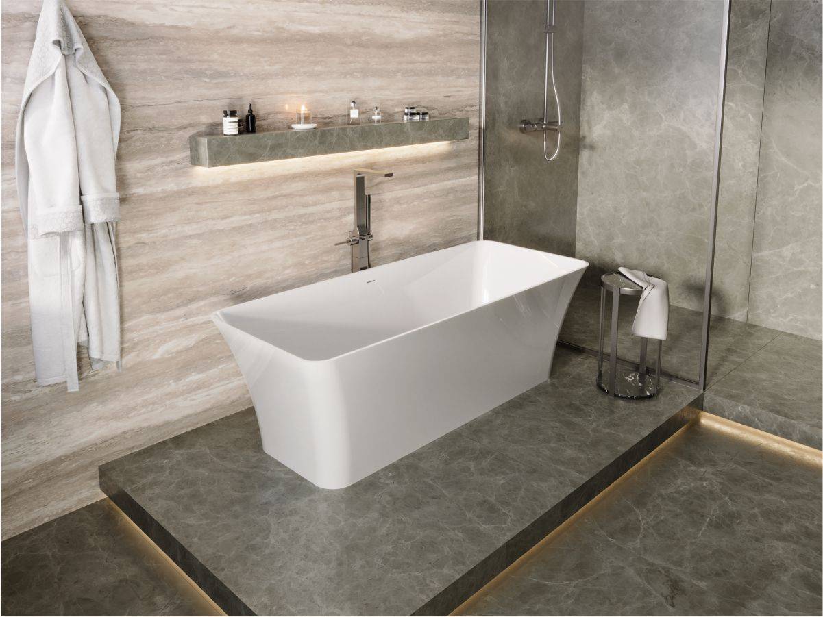 Ванна зі штучного каменю MIRAGGIO - ідеальний варіант доповнення сучасного інтер'єру ванної кімнати. Прямокутна;Чаша ванна BONITA з матеріалу Miramarble - це досконале творіння за дизайном та функціональністю. Поверхня ванни - глянець. Тип встановлення ванни - окремостояча.