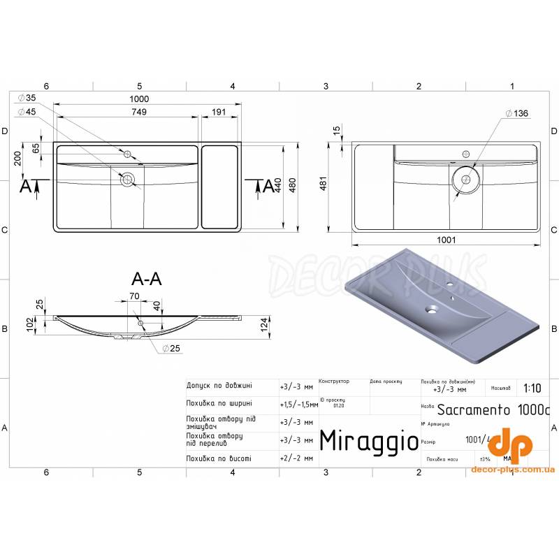 | Отвір під змішувач, шт. | 1 |