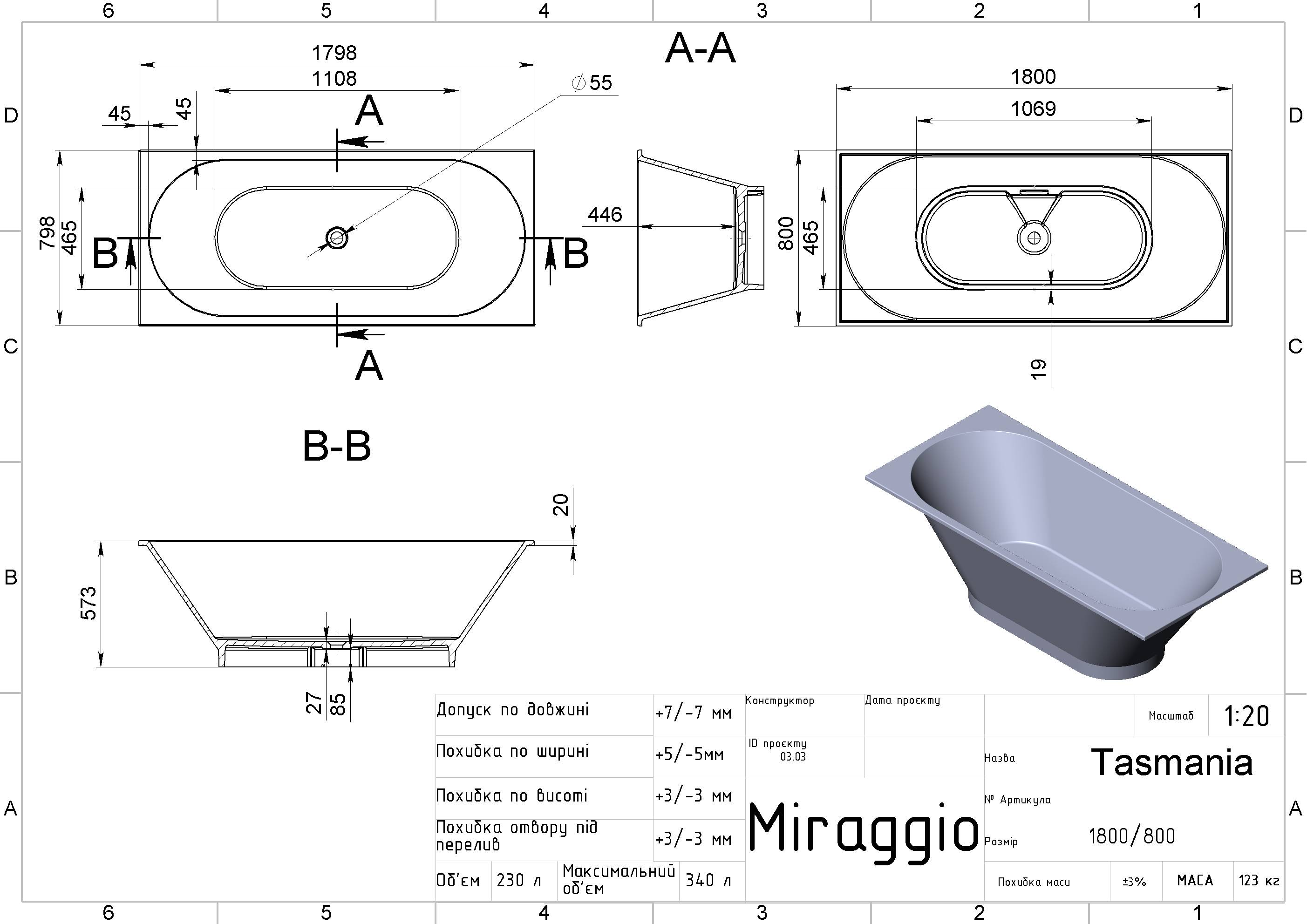 | Назва | Ванна MIRAGGIO TASMANIA вбудована 180*80*49 Mirasoft Біла 0001128 |