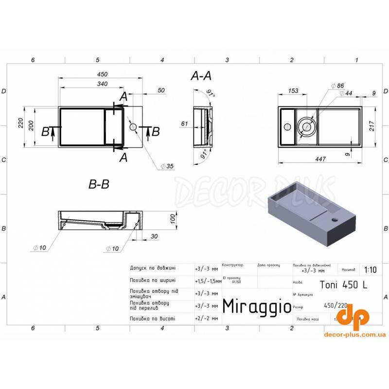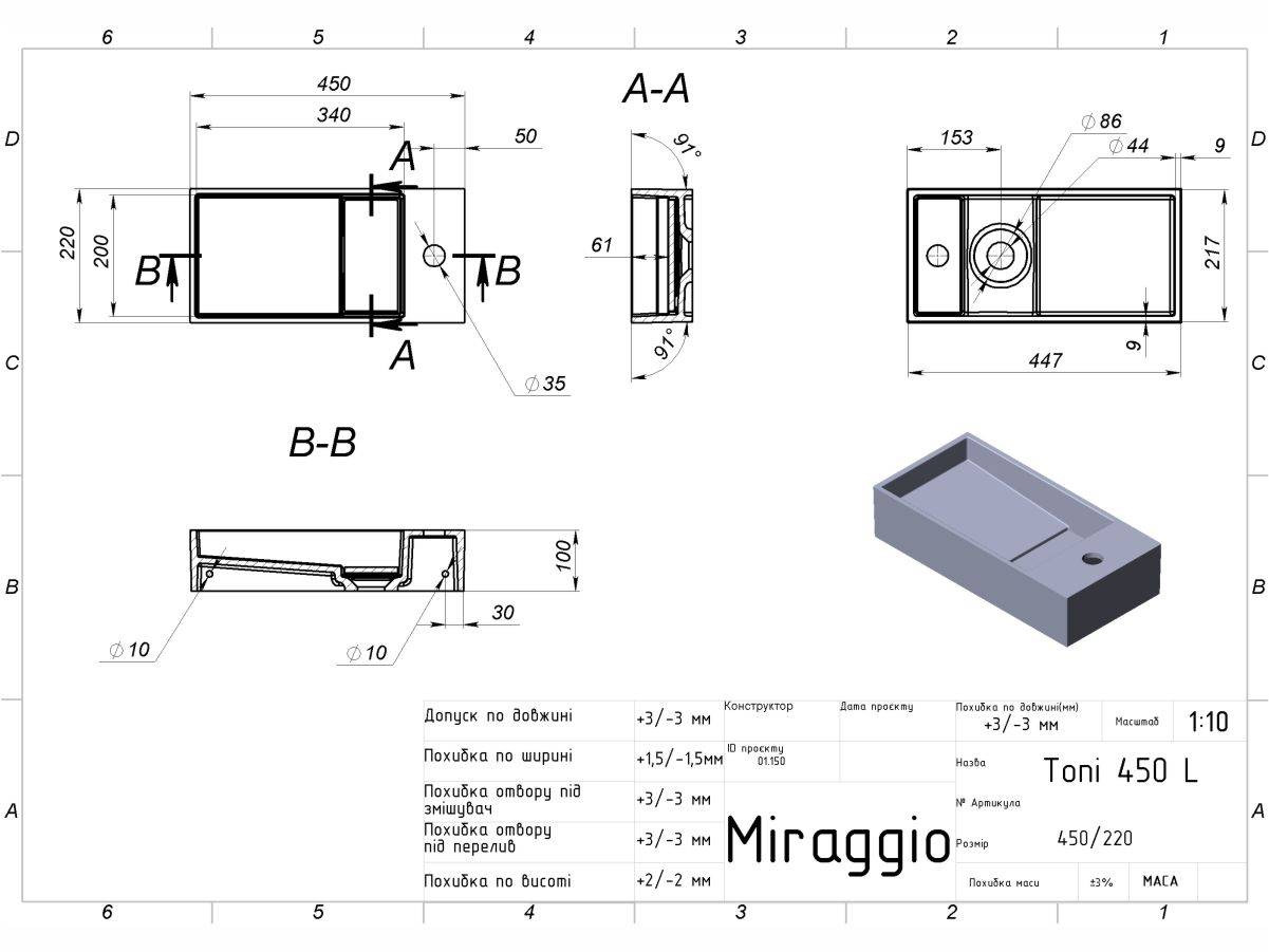 Умивальник TONI 450 L від бренду MIRAGGIO - це ідеальне рішення для санвузла дому, готелю чи дачі.