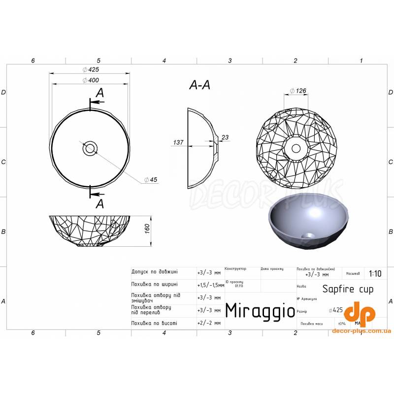 | Назва | Умивальник накладний MIRAGGIO SAPFIRE 16*42,5*42,5 Mirasoft Білий 0002256 |