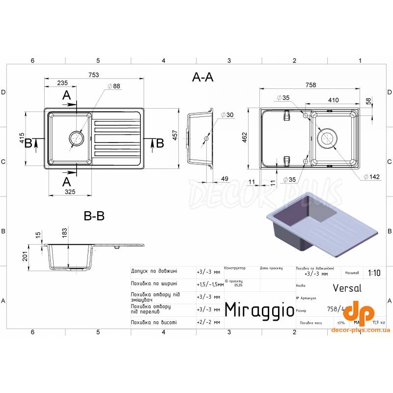 | Назва | Кухонна мийка врізна MIRAGGIO VERSAL 47*76*21 Терра 0000062 |